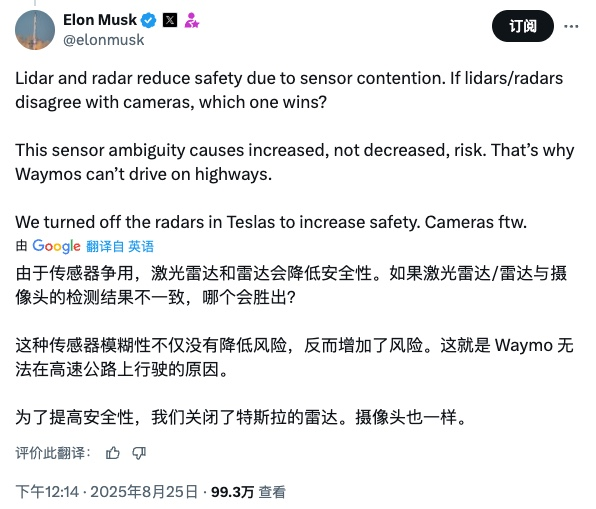 马斯克近日在社交媒体上指出:"激光雷达和雷达会降低安全性,因为存在传感器冲突。如果激光雷达与摄像头不一致,那么该相信哪一个?这种传感器模糊性导致的是风险增加,而不是减少。" 他进一步举例称:"这就是为什么 Waymo 无法在高速公路上行驶。我们在特斯拉上关闭了雷达,以提高安全性。"