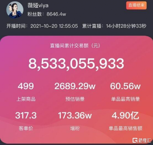 而另一边薇娅也成果满满,虽然没有突破百亿,但也打到了82亿的超高交易额。其累计直播时间更是超过14个小时,销售量高达499个品类,皆超李佳琦。而同赛道的第三雪梨、第四烈儿宝贝,带货金额则为9.3亿、1.59亿元。这么一看,她和李佳琦可谓以断层优势远超同业其他选手。