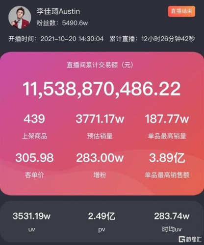 期间李佳琦上架439类商品,直播间累计交易额高达115亿元,预估销量达3771万,增粉283万人。也就是说,以一己之力就轻松远超去年他和薇娅带货的总和,掀翻2021年双十一的火爆开场。
