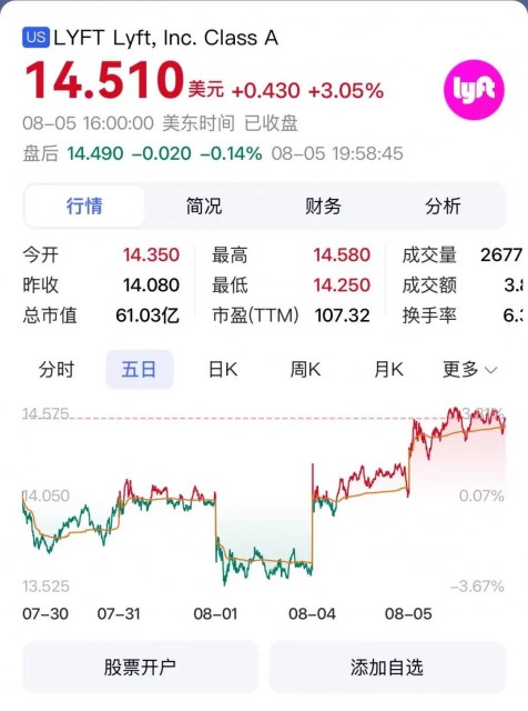 合作宣布后,Lyft一跃成为了“萝卜概念股”。美东时间8月4日,Lyft股价报收14.08美元/股,上涨3.38%。8月5日盘前,Lyft股价继续涨超2%。