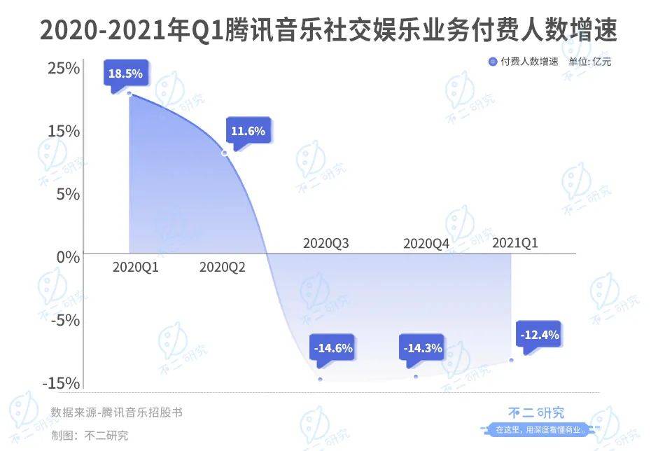 「不二研究」认为,这是由于其社交娱乐业务付费人数的快速萎缩,2020-2021年Q1共五个季度的付费人数增速持续下滑,数据自18.5%,11.6%,跌至-14.6%、-14.3%和-12.4%。
