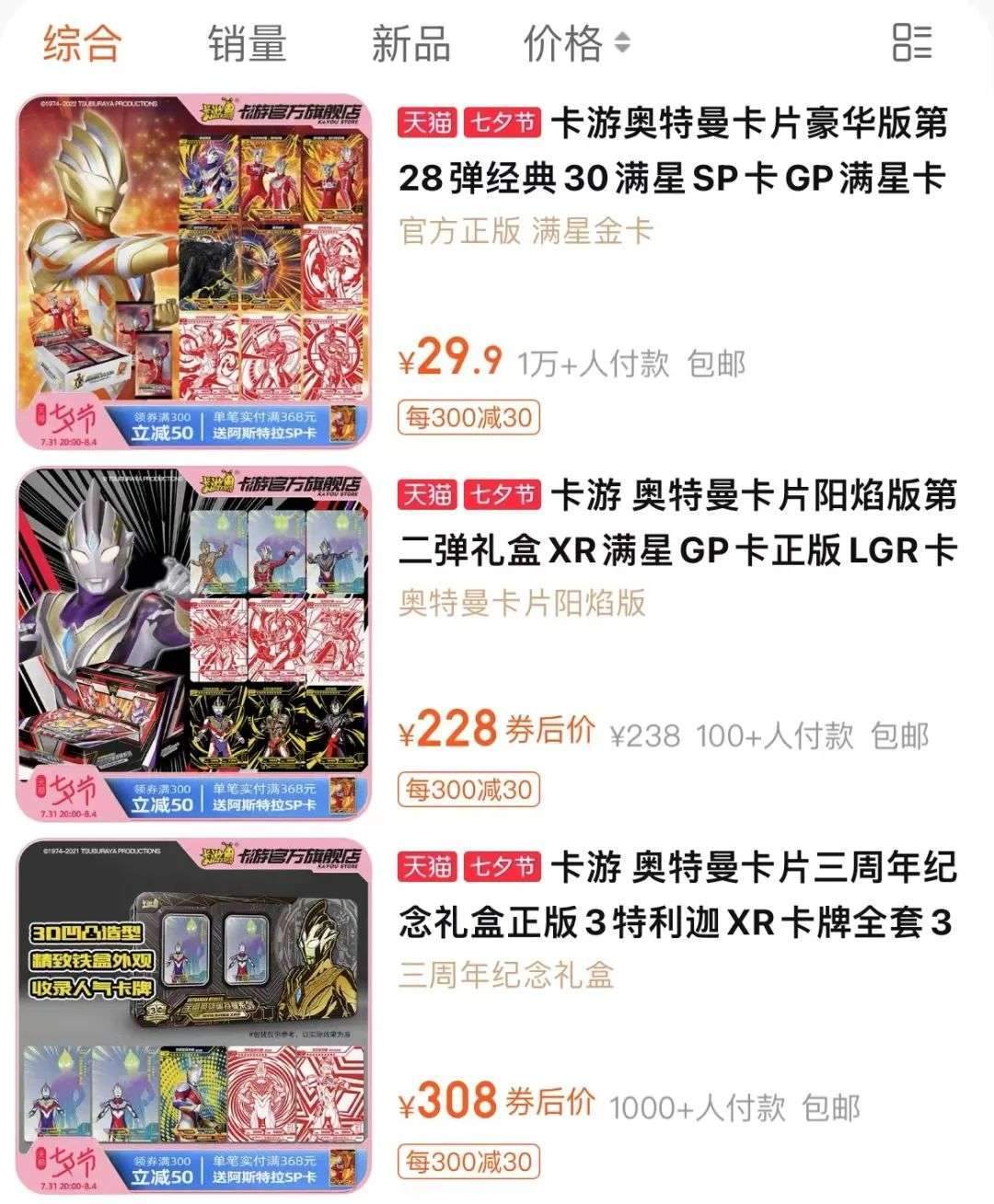 卡游旗舰店售卖的奥特曼卡牌最低售价为29.9元一套150张,最贵的三周年纪念礼盒装售价358元,包含高级别的XR卡两张,卡牌30张,补充包4包32张,卡砖1个,收藏册1本。