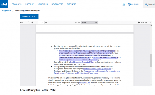“Our investors and customers have inquired whether Intel purchases goodsor services from the Xinjiang region of China. Multiple governments haveimposed restrictions on products sourced from the Xinjiang region.Therefore, Intel is required to ensure our supply chain does not use any laboror source goods or services from the Xinjiang region”