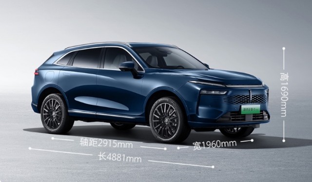 车身侧面,整体设计十分简洁利落,采用悬浮式车顶,配备了隐藏式门把手,另外翼子板处还配备有摄像头。车身一侧配备了快充和慢充接口,另外还支持3.3kW对外放电功能。车尾部分采用双层贯穿式尾灯,拥有非常强的辨识度。车身尺寸方面,新车长宽高分别为4881/1960/1690mm,轴距为2915mm,定位为中型SUV。