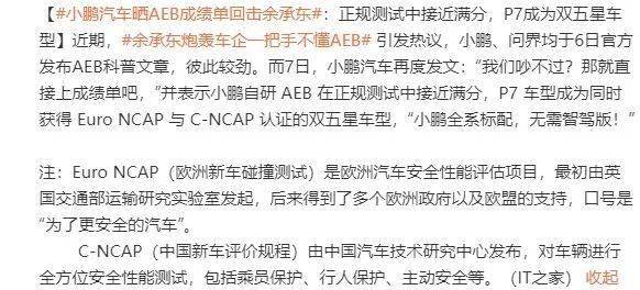 表示自己的 P7 车型在欧洲和国内的技术测试中, AEB 项目都能接近满分!