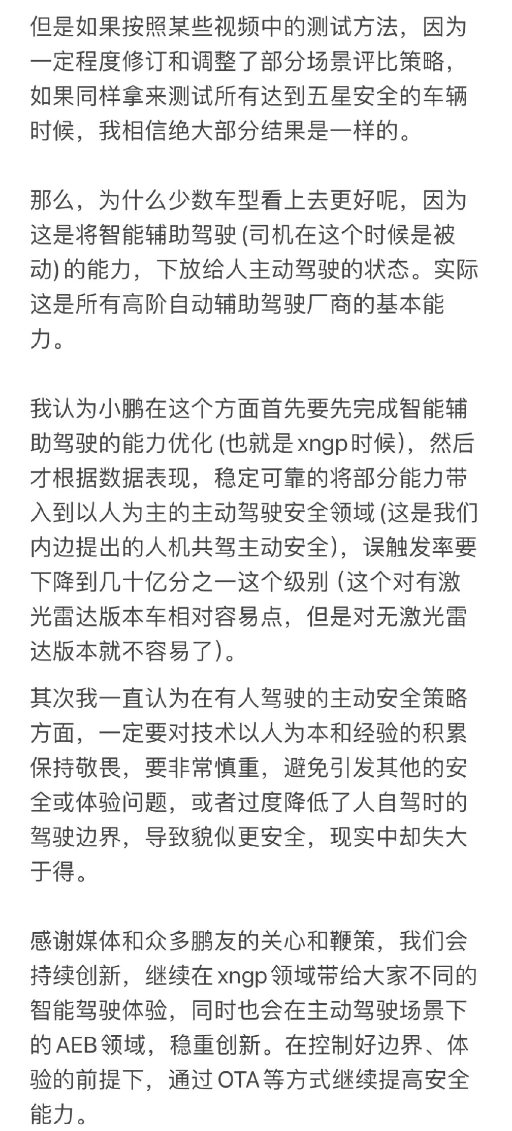回到最开始引起轩然大波的媒体采访,在被问到自己会怎么做 AEB 的时候,何小鹏是这么说的: