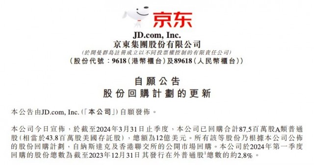 京东集团2024年Q1回购8750万股普通股 价值12亿美元快讯