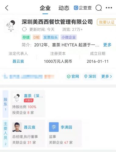 由喜茶(深圳)企业管理有限责任公司100%控股,该公司成立于2016年。