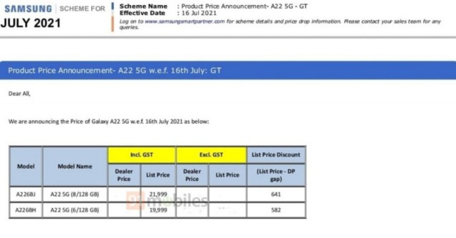 7 月 18 日消息 三星 Galaxy A22 5G 手机将于 8 月份在印度发布。据外媒 91mobiles,零售渠道透露的信息称,该机 6GB+128GB 版的售价为 19999 印度卢比(约 1733.91 元人民币),而 8GB+128GB 版的售价为 21999 印度卢比(约 1907.31 元人民币)。