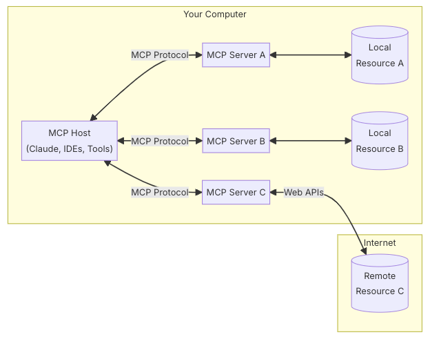 - 本地资源:MCP服务器可以安全访问的计算机资源(数据库、文件、服务)
