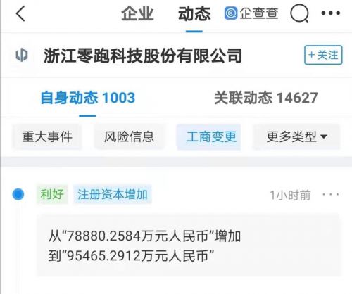 【TechWeb】企查查APP显示,近日,浙江零跑科技股份有限公司发生工商变更,公司注册资本由7.89亿元人民币增加至9.55亿元人民币。