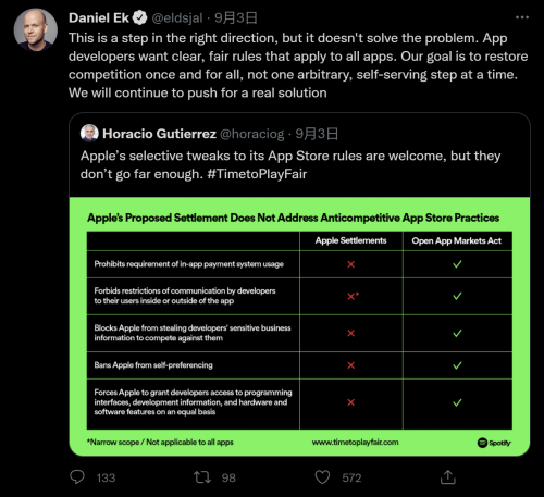 Spotify首席执行官Daniel Ek在社交媒体上表示,“我们的目标是永久地恢复市场竞争,而不是一次次武断地、自以为是地前进一小步。”他补充称,“我们将追寻一个真正的解决方案。”