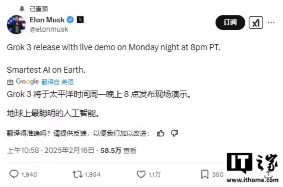 IT之家 2 月 16 日消息,马斯克在社交平台 X 上表示,Grok 3 大模型将于太平洋时间周一晚上 8 点(IT之家注:北京时间 2 月 18 日 12 点)发布,届时将进行现场演示,马斯克称其为地球上最聪明的人工智能。