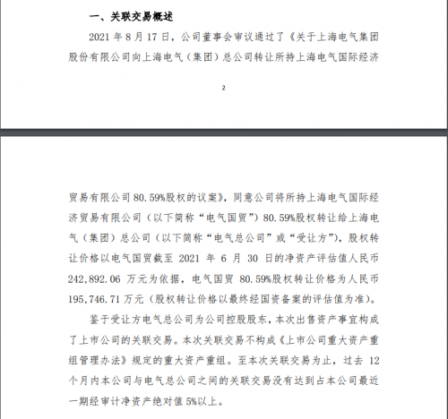同日晚间,上海电气还发布了另一则公告称,8月17日,公司将所持上海电气国际经济贸易有限公司80.59%股权转让给上海电气(集团)总公司,股权转让价格约人民币19.57亿元。