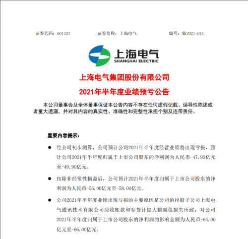 对于2021年半年度业绩出现亏损,上海电气表示,主要原因是公司的控股子公司上海电气通讯技术有限公司(以下简称“上海电气通讯”)应收账款和存货计提大额减值损失所致,对公司2021年半年度归属于上市公司股东的净利润的影响金额为人民币-64.00亿元至-66.00亿元。