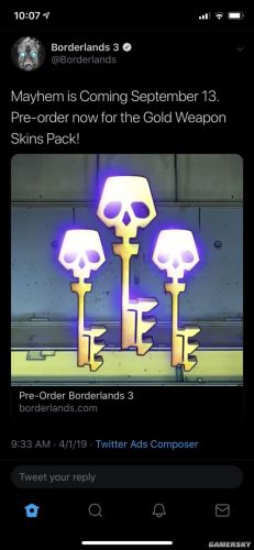 《无主之地》官方推特今天疑似不小心曝光了《无主之地3》的发售时间,但随后又删除了相关图文,时间显示发售日期是9月13日,并且预购还会有黄金武器皮肤奖励。
