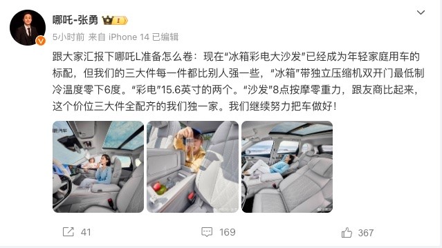 据了解,哪吒L搭载了6.6L大容量车载冰箱,拥有独立压缩机,支持-6~6℃冷藏和35~50℃保温功能,锁车也能用。彩电拥有,6.7mm超窄黑边框,12mm超薄京东方屏,1920mm*1080mm高清分辨率双15.6英寸一体中控屏大彩电。沙发拥有,搭配123°最大臀角,加热按摩通风功能,74mm座椅厚度以及5种按摩模式8点按摩、一键SPA零重力大沙发。