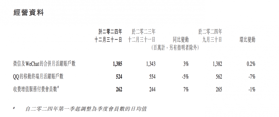收费增值服务付费会员数为2.62亿,同比增长7%。其中,腾讯视频付费会员数达到1.13亿,腾讯音乐付费会员数增至1.21亿。