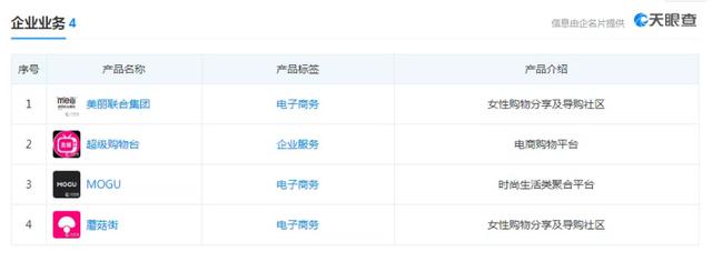 根据天眼查检索显示的信息来看,在企业业务一栏显示有美丽联合集团、超级购物台、MOGU还有蘑菇街。和出发时的方向一样,女性看起来依旧是蘑菇街最主要的服务群体。在对品牌调性的坚持上,蘑菇街做的其实很好。