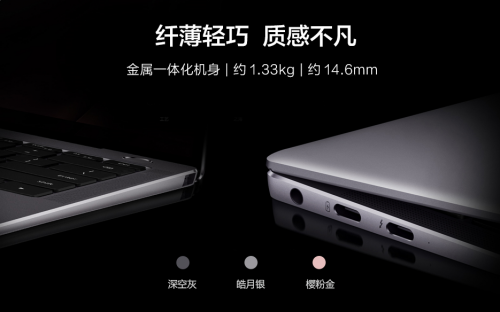 新款HUAWEI MateBook X Pro延续金属一体化机身和整机CNC钻切工艺,配合精密陶瓷喷砂,带来细腻触感。机身最厚处14.6mm,重量仅为1.33Kg,提供深空灰、皓月银和樱粉金三色可选。