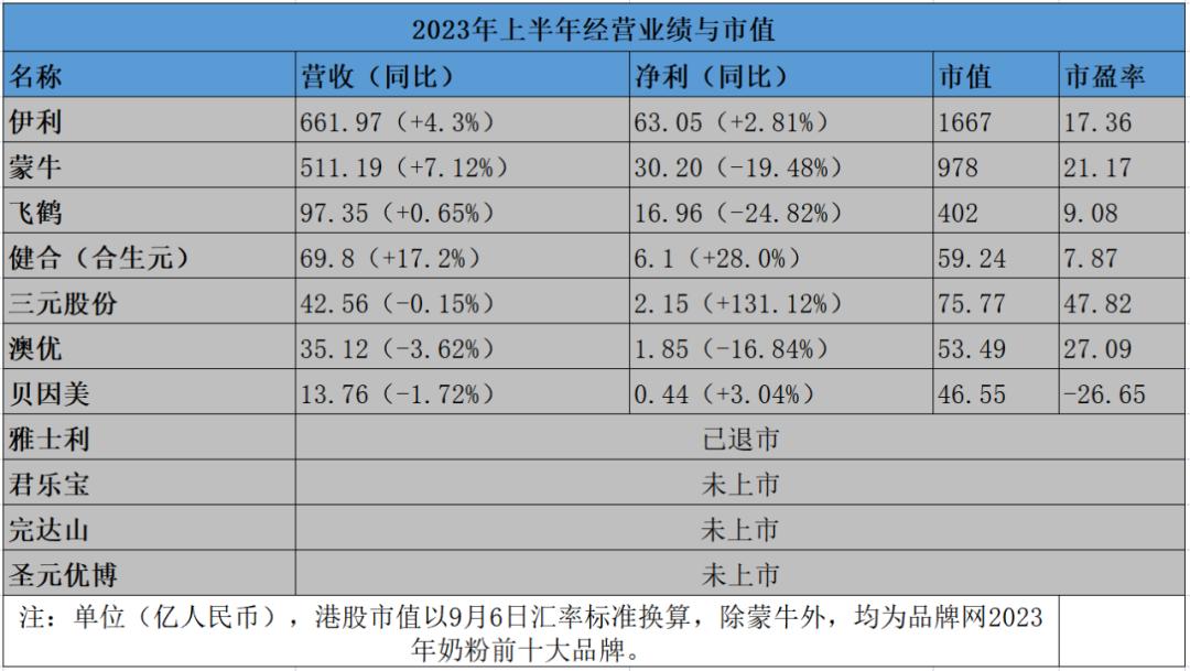 此外,从上表中的市值及营收数据可以看到,前十大奶粉品牌中,两极分化严重,上半年市值超过百亿的仅三家,营收超过百亿的仅伊利、蒙牛。
