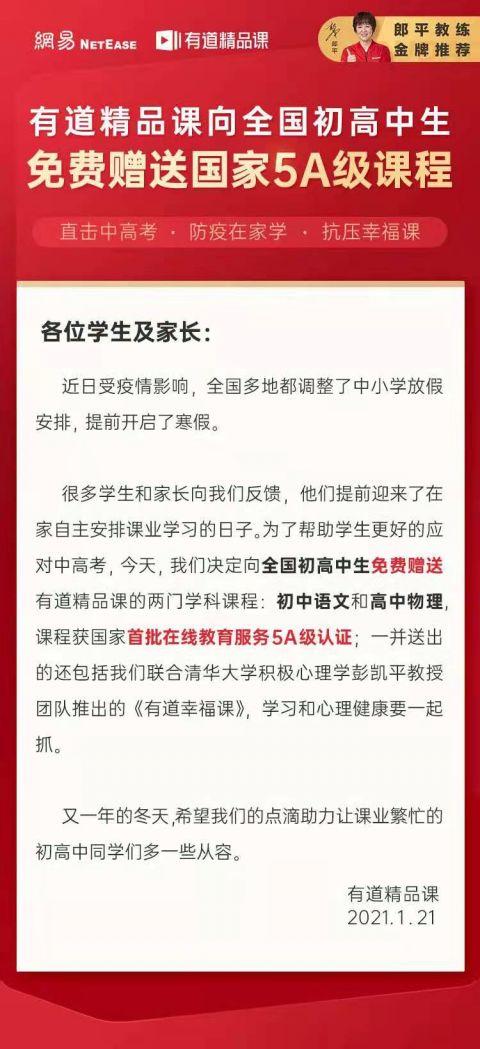 1月20日,网易旗下的中小学在线教育品牌有道精品课宣布,向全国初高中学生免费提供初中语文、高中物理两门优势学科的寒假课程,以及积极心理学课程《有道幸福课》。