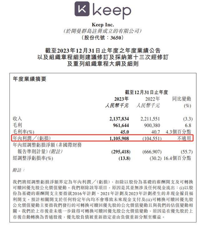 据keep发布的业绩报告显示,截至2023年12月31日,公司的年度利润达到了人民币11亿元,而在前一年度(截至2022年12月31日)则出现了人民币1.046亿元的亏损。截至2023年12月31日keep的年度经调整亏损净额为人民币2.954亿元,而前一年度则为人民币6.669亿元。