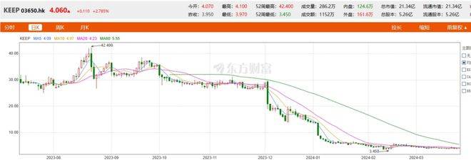 Keep登陆港股后的一个多月内,股价还是呈现出欣欣向荣的态势,于2023年8月22日达到截止目前的股价最高点42.40港元每股。但自此之后,keep的股价就一路向下走,2023年12月后更是如同跳水般的狂跌。截止4月1日撰稿时,keep股价为4.060港元每股,对比初始发行价下跌了85.96%,对比股价最高点则下跌了90.42%。目前公司总市值为21.34亿港元,对比巅峰时的223亿港元蒸发了90%以上。