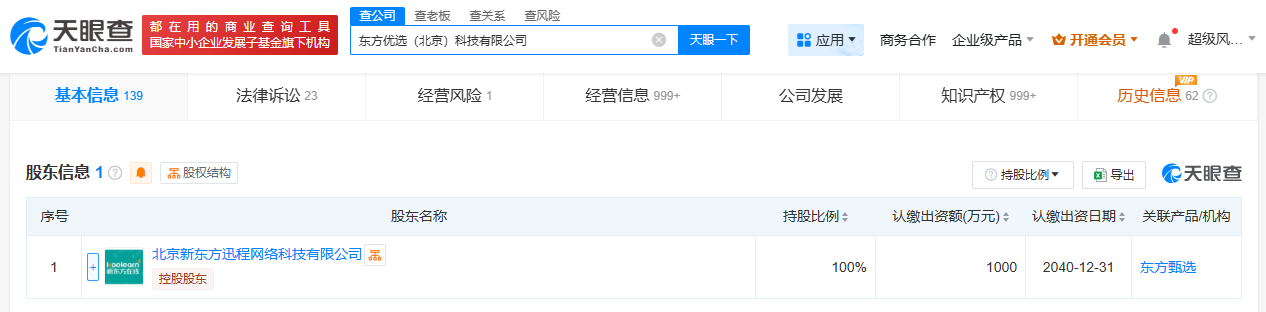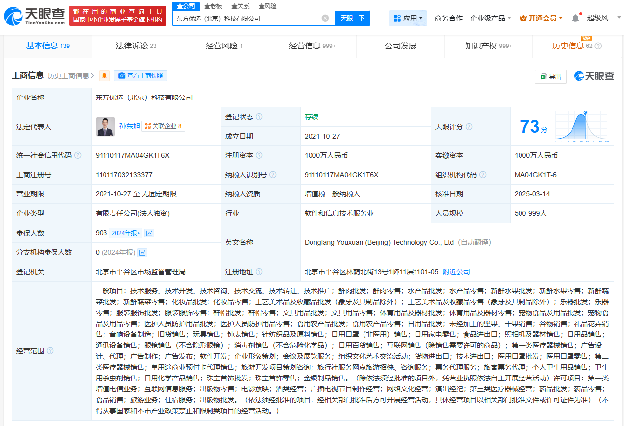 东方优选(北京)科技有限公司成立于2021年10月,法定代表人为孙东旭,注册资本1000万人民币,经营范围包括广播电视节目制作经营、网络文化经营、演出经纪等,由北京新东方迅程网络科技有限公司全资持股。