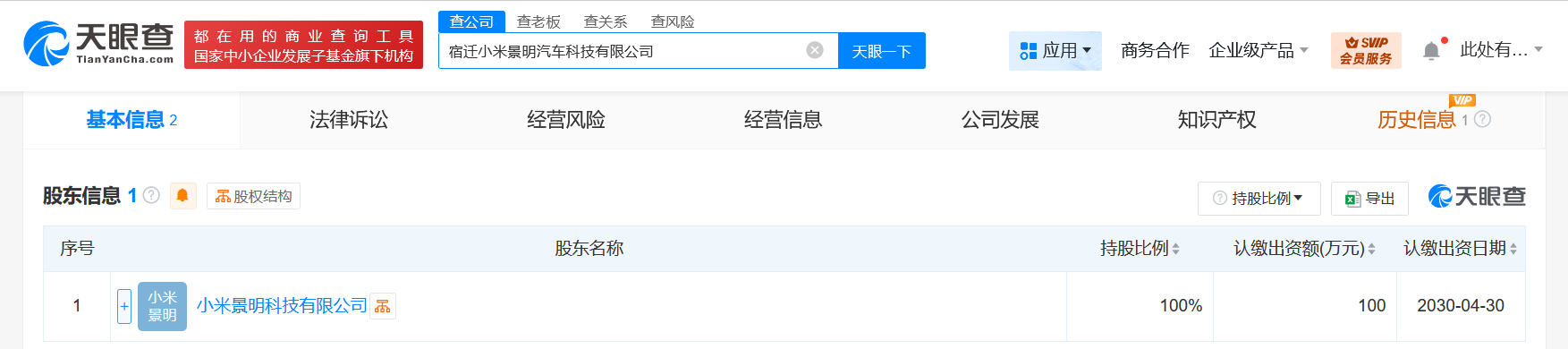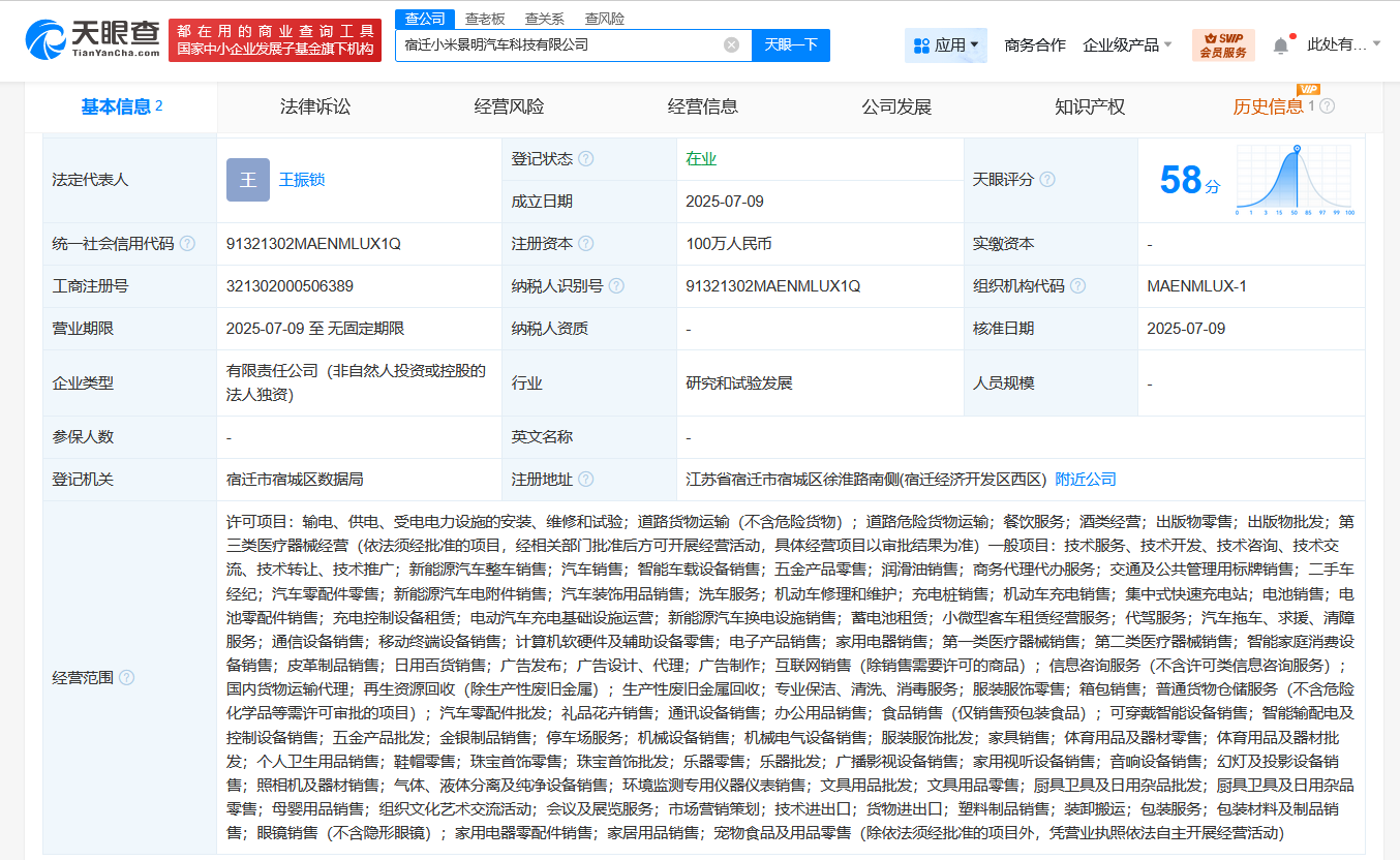 天眼查App显示,近日,宿迁小米景明汽车科技有限公司成立,法定代表人为王振锁,注册资本100万人民币,经营范围含输电、供电、受电电力设施的安装、维修和试验,道路货物运输,道路危险货物运输,餐饮服务,酒类经营,新能源汽车整车销售,汽车销售,二手车经纪等。股东信息显示,该公司由小米景明科技有限公司全资持股。