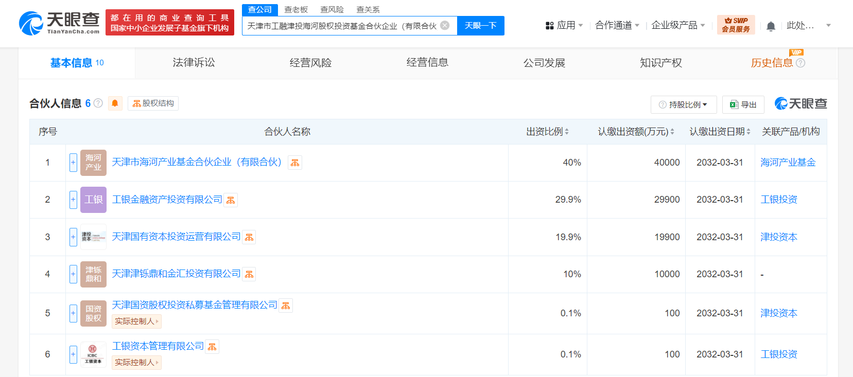 天眼查App显示,近日,天津市工融津投海河股权投资基金合伙企业(有限合伙)成立,执行事务合伙人为工银资本管理有限公司、天津国资股权投资私募基金管理有限公司,出资额10亿人民币,经营范围为以私募基金从事股权投资、投资管理、资产管理等活动。合伙人信息显示,该基金由天津市海河产业基金合伙企业(有限合伙)、工银金融资产投资有限公司、天津国有资本投资运营有限公司、工银资本管理有限公司等共同出资。