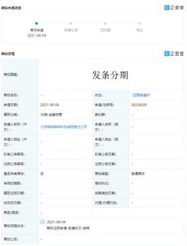 商标申请信息,发条分期,发条借钱。