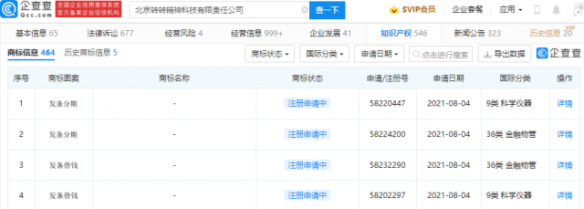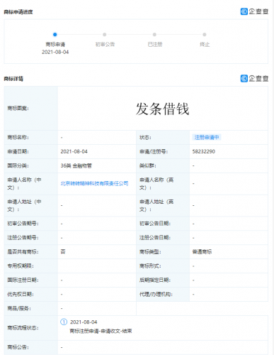 【TechWeb】企查查APP显示,8月4日,北京转转精神科技有限责任公司新增“发条借钱”、“发条分期”商标申请信息,国际分类涉及金融物管、科学仪器,目前商标状态均为“注册申请中”。