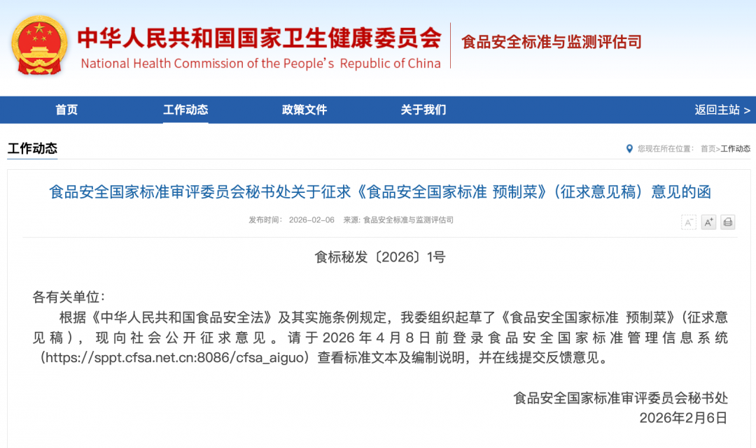 国家卫生健康委今天发布《食品安全国家标准 预制菜》(征求意见稿)(以下简称“标准”),面向社会公开征求意见。