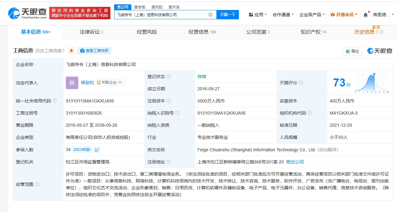 天眼查App显示,飞鸽传书(上海)信息科技有限公司成立于2016年9月,法定代表人为侯劲松,注册资本5000万人民币,经营范围包括从事信息科技、网络科技、计算机科技领域内的技术开发、技术转让、技术咨询、技术服务等,由侯劲松、张玥共同持股。天眼风险信息显示,该公司曾因侵害商标权纠纷被起诉。知识产权信息显示,该公司已登记多个软件著作权,包括飞鸽短信直连网关测试工具软件、飞鸽新一代融合通讯客户服务平台软件、飞鸽集中监控平台软件、飞鸽语音呼叫软件等软件著作权。