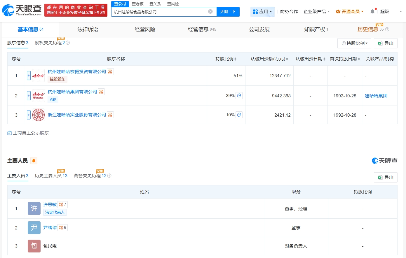 该公司成立于1992年10月,注册资本约2.4亿人民币,经营范围为食品销售(仅销售预包装食品)。股东信息显示,该公司由杭州娃哈哈宏振投资有限公司、杭州娃哈哈集团有限公司、浙江娃哈哈实业股份有限公司共同持股。