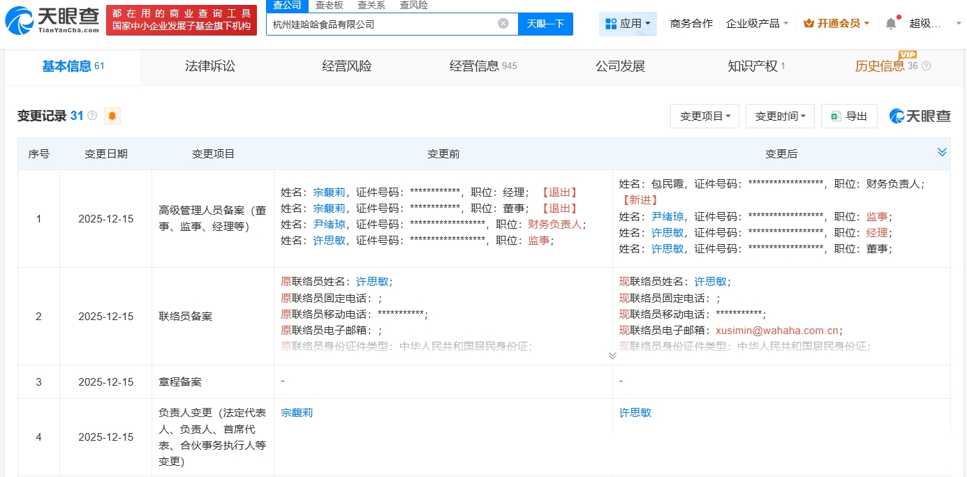 天眼查工商信息显示,近日,杭州娃哈哈食品有限公司发生工商变更,宗馥莉卸任法定代表人、董事、经理,由许思敏接任,同时部分高管也发生变更。