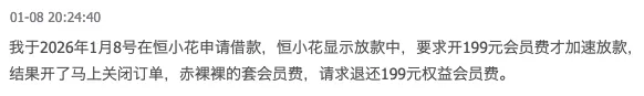 1月8日,一名用户就宣称,“我于2026年1月8号在恒小花申请借款,恒小花显示放款中,要求开199元会员费才加速放款,结果开了马上关闭订单,赤裸裸的套会员费,请求退还199元权益会员费。”