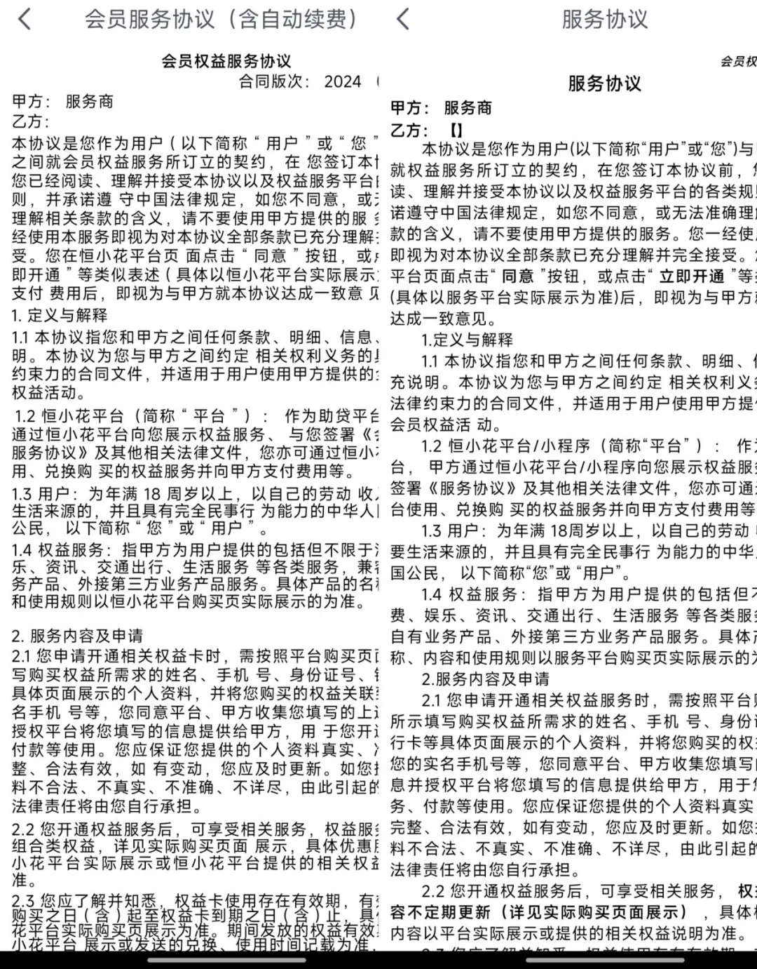 更值得警惕的是,无论是购买季卡还是半年卡,《会员服务协议(含自动续费)》中均以“服务商”替代甲方主体,未明确具体运营机构。