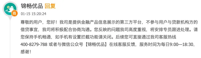 对此,锦畅优品回复称,“我司是提供金融产品信息展示的第三方平台,不参与用户与贷款机构方的借贷事宜……后续您可直接通过我司客服热线……或者与微信公众号【锦畅优品】在线客服反馈。”