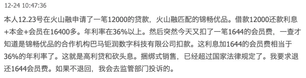 一名用户在2025年12月24日投诉称,“本人12月23号在火山融申请了一笔12000元的贷款,火山融匹配的锦畅优品。借款12000还款利息+本金+会员在16400多元。年利率在36%以上。然后突然今天又扣了一笔1644元的会员费,一查才知道是锦畅优品的合作机构巴马钜润数字科技有限公司扣款。”