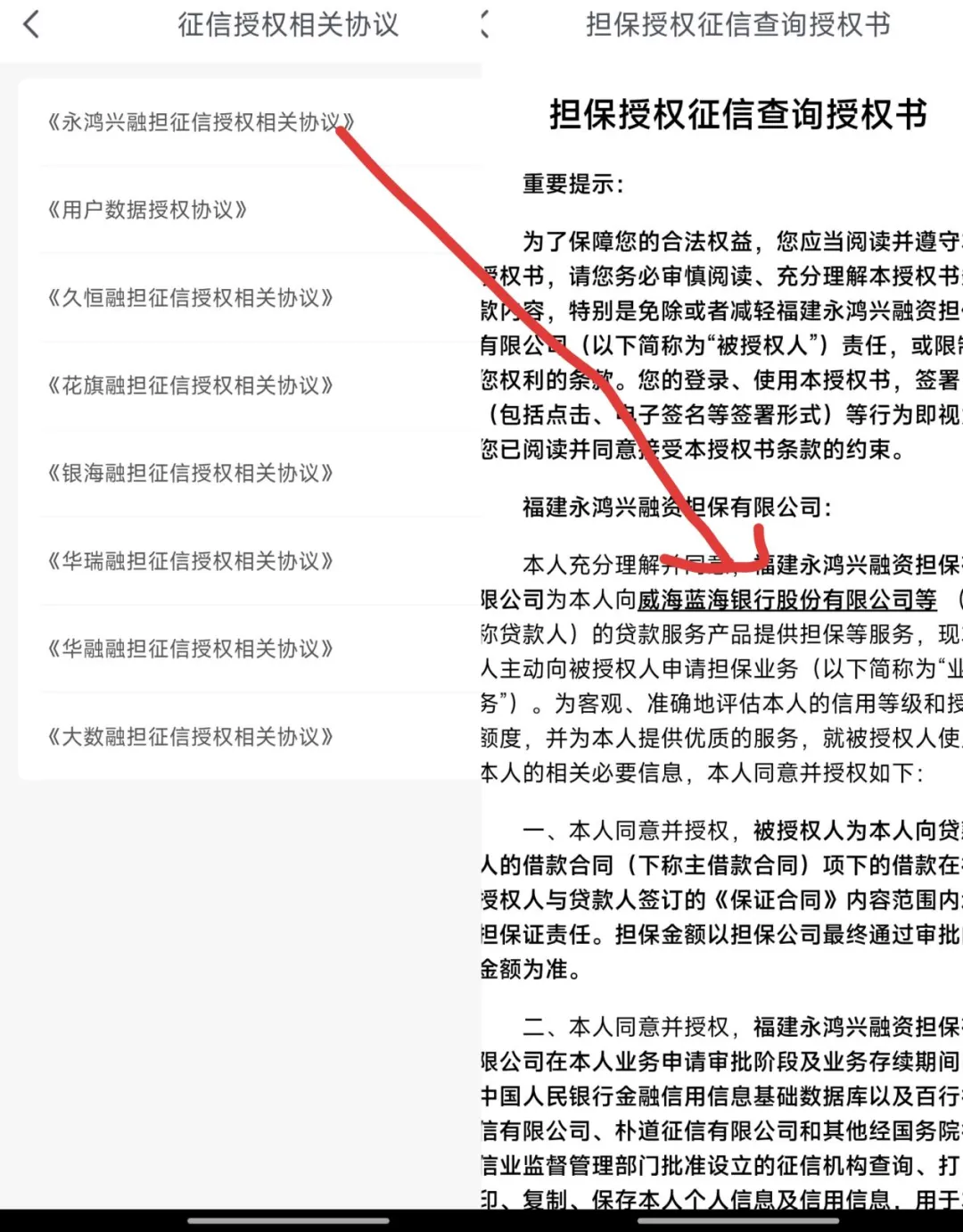 其中的《永鸿兴融担征信授权相关协议》显示,福建永鸿兴融资担保有限公司受借款人委托,为其向威海蓝海银行等机构的借款产品提供担保服务。