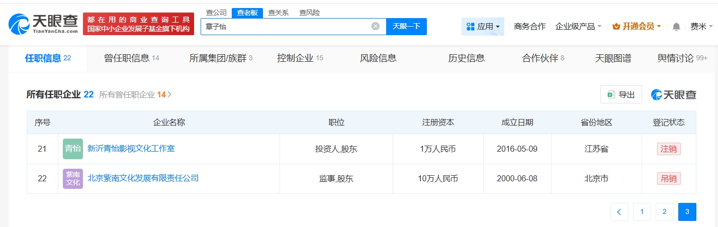 天眼查App显示,章子怡名下关联22家企业,其中10余家企业处于存续状态,包括深圳兴旺红筹回归投资中心(有限合伙)、北京青山基业天使投资合伙企业(有限合伙)、北京阿丁特科技有限公司等,其他10余家企业已注销或者被吊销。值得注意的是,章子怡与田栩宁无商业关联。