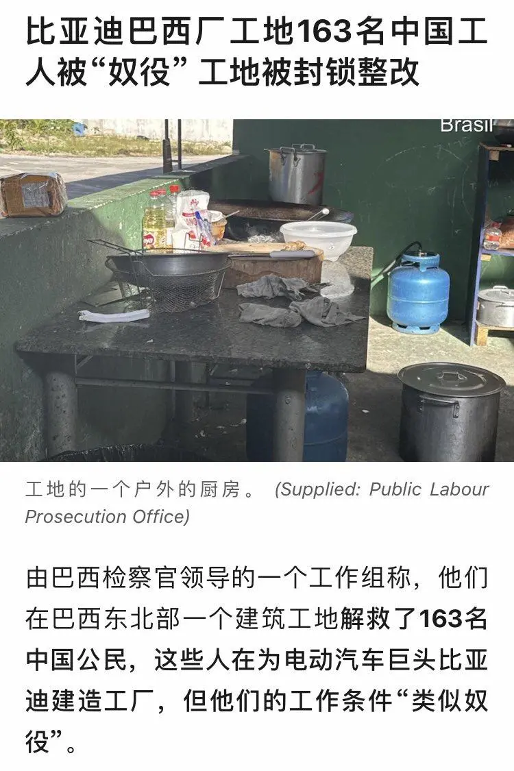 乐逗同学注意到,比亚迪这个巴西工厂涉嫌“奴役”工人一事,并非此番才引发巨大争议和关注,早在2024年12月份,就曾搞出过特别大的动静,引发国内外媒体广泛关注。