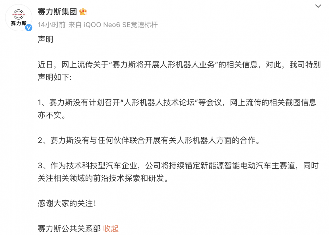 【TechWeb】11月5日消息,昨日晚间,赛力斯在官博发布声明称,近日,网上流传关于“赛力斯将开展人形机器人业务”的相关信息,赛力斯没有计划召开“人形机器人技术论坛”等会议,网上流传的相关截图信息亦不实。
