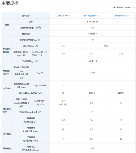 【TechWeb】12月18日消息,东芝电子元件及存储装置株式会社(“东芝”)近日宣布,推出三款采用业界最小封装之一的4-Form-A电压驱动光继电器--“TLP3407SRA4”,”TLP3412SRHA4”与 “TLP3475SRHA4“,这三款器件于近日开始支持批量出货。