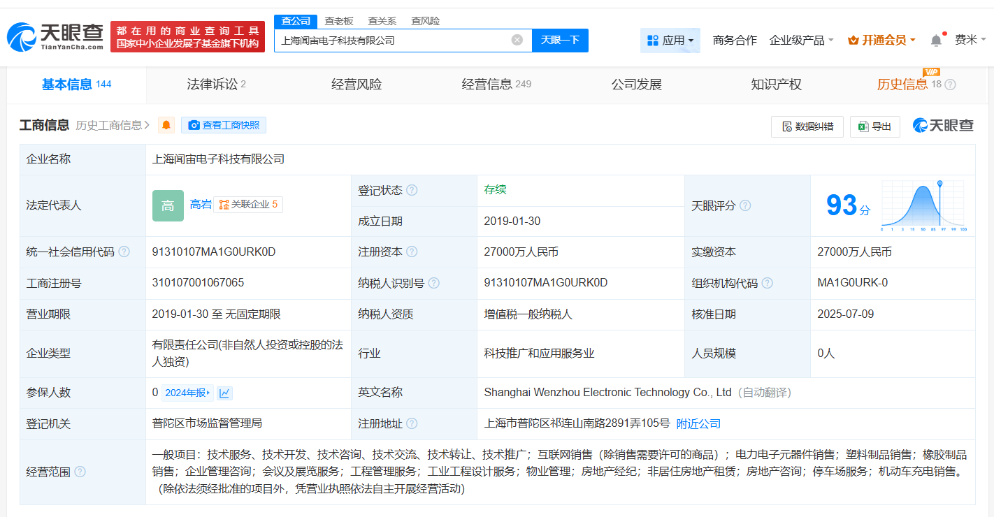 上海闻宙电子科技有限公司成立于2019年1月,注册资本2.7亿人民币,经营范围包括互联网销售、电力电子元器件销售、塑料制品销售等。