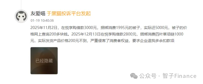 一位用户表示,2025年11月2日,他在悦享购申请借款3000元,却被强制捆绑消费一款标价1995元的被子,最终需实际还款5000元;但他通过网络查询发现,同款被子的市场价格仅200余元。无独有偶,另一位用户在2025年12月13日借款2800元时,被要求捆绑购买标价1000元的四叶草项链,而收到的实物价格不足200元。