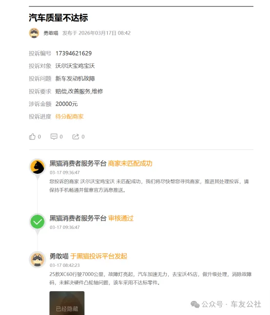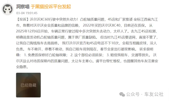 3月12日,我们曾对沃尔沃凸轮轴集体投诉进行报道准新车就拆发动机引发集体投诉,沃尔沃能否逃脱凸轮“咒”?。故障主要涉及 2022 款至 2026 款搭载轻混 B 系列发动机的沃尔沃 S90、S60、XC60 等主力车型,XC60 正是该故障的主要爆发车型之一,多位车主不仅遭遇核心部件质量问题,还频频陷入售后维权难的困境。