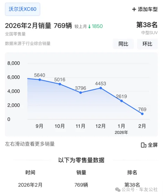 作为沃尔沃史上最畅销车型,XC60曾长期支撑品牌销量,2025年其月零售量基本保持在3700—8000辆区间,2025年6月更是创下7179辆的全年销量峰值。但进入2026年,XC60销量出现大幅下滑,2026年1月-2月零售量仅3388辆,较2025年1-2月9977辆,同比大跌66%。